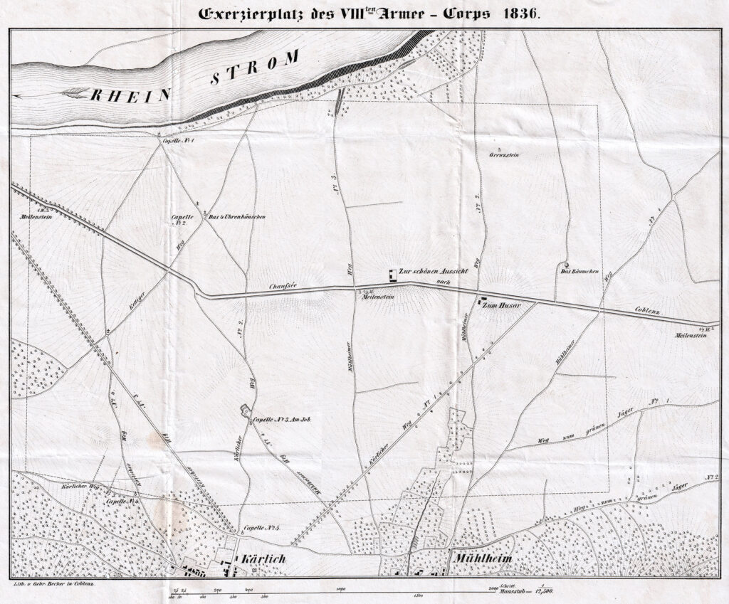 Das Fundstück der Woche 11/2026 ist eine Karte des Gebiets zwischen Mülheim und Kärlich und dem Rhein. Sie zeigt den Exerzierplatz des VIII. Armeekorps, dessen Generalkommando seinen Sitz in Koblenz hatte. Die Karte wurde im Koblenzer Lithographischen Institut der Gebrüder Becker gedruckt.