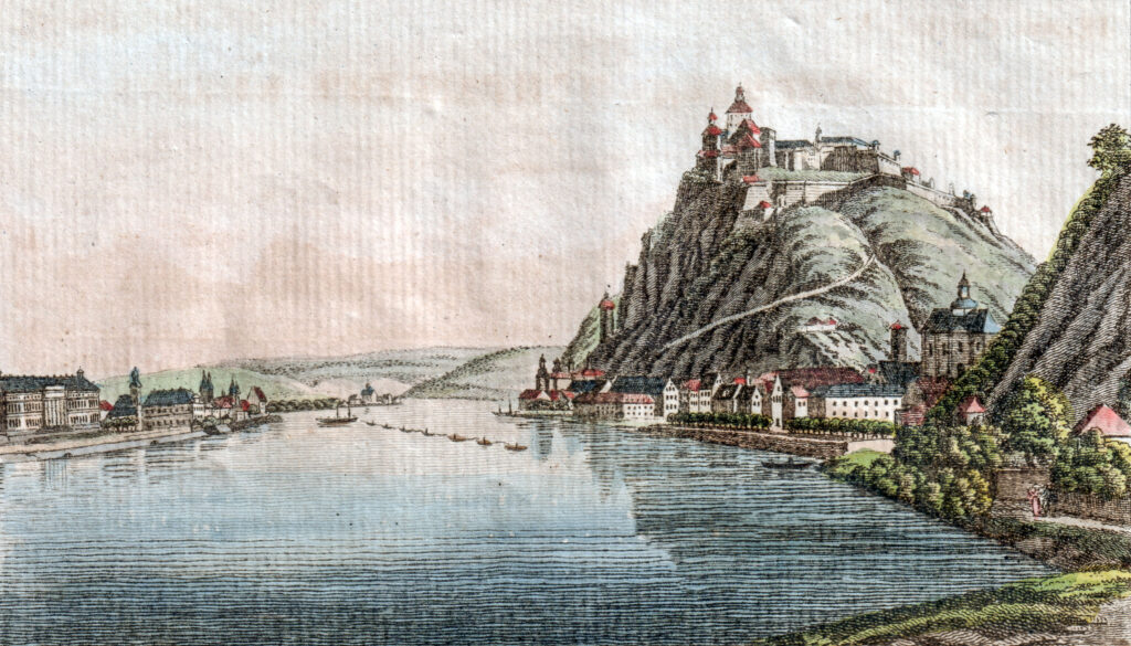 „Ein halsbrechendes Abenteuer! Ich komme von den Ruinen von Ehrenbreitstein. Welche Verwüstung! Welche Empfindung; Werke, welche Jahrhunderte lang der Witterung, der Barbarei und dem Heldenmuthe unbezwingbar waren, in Steinhaufen verwandelt zu sehen! […] Die Ruine von Ehrenbreitstein ist schauerlich schön.“[1] Von diesen Eindrücken des unbekannten Autoren legen heute noch unzählige Bilddokumente wie das hier gezeigte Zeugnis ab. Auch vor Ort in der preußischen Feste Ehrenbreitstein, die ab 1817 an der gleichen Stelle errichtet wurde, finden sich heute noch zahlreiche Spuren der zerstörten kurtrierischen Vorgängeranlage.
