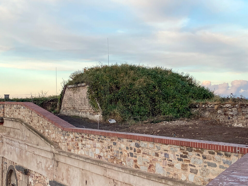 Das Fundstück der Woche 40/2025 ist ein Buntsandsteinquader mit einer Inschrift. Er erinnert vermutlich an den Umbau der Feste Kaiser Franz in den Jahren 1864/1865. Dieser war nötig geworden, da sich mit der Einführung gezogener Rohre bei den Kanonen die Reichweite der Artillerie und ihre Wirksamtkeit massiv erhöht hatten.