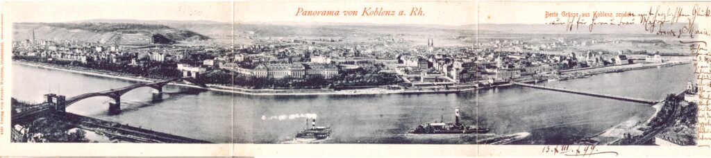 Das Fundstück der Woche ist eine Panoramakarte von Koblenz um 1898. Hier finden sich bei genauerer Betrachtung des Bereichs nördlich des Koblenzer Schlosses einige interessante Details.